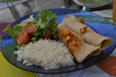 Para rechear, fiz um molho de tomate com PTS média e milho. Arroz e saladinha para acompanhar.