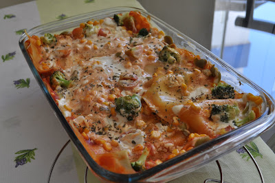 Demorei mas percebi que o queijo é apenas um coadjuvante quando se trata de pizza e lasanha. O que importa mesmo é uma boa massa e um molho bem feito. Baseada nisso, fiz esta lasanha com molho branco, molho vermelho, brócolis, milho e tomates cerejas. Ela não ficou lá muito bonita, mas estava bem gostosa e foi um ótimo almoço de domingo.
